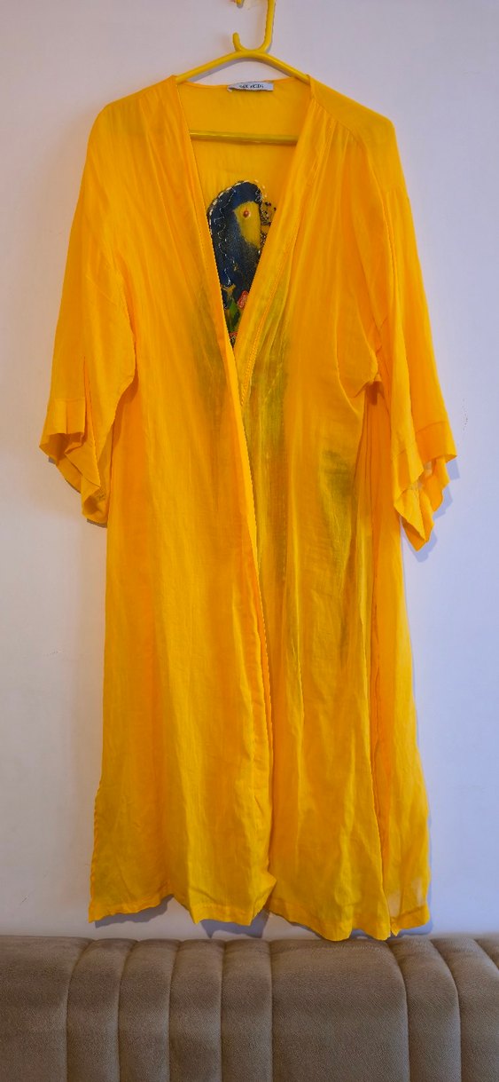 Kadınlar için uzun, bol kesim, kısa kollu, canlı sarı tonlarında, sırtı islemeli, bohem tarzı cübbe. Parlak ve akışkan görünüm sunar.