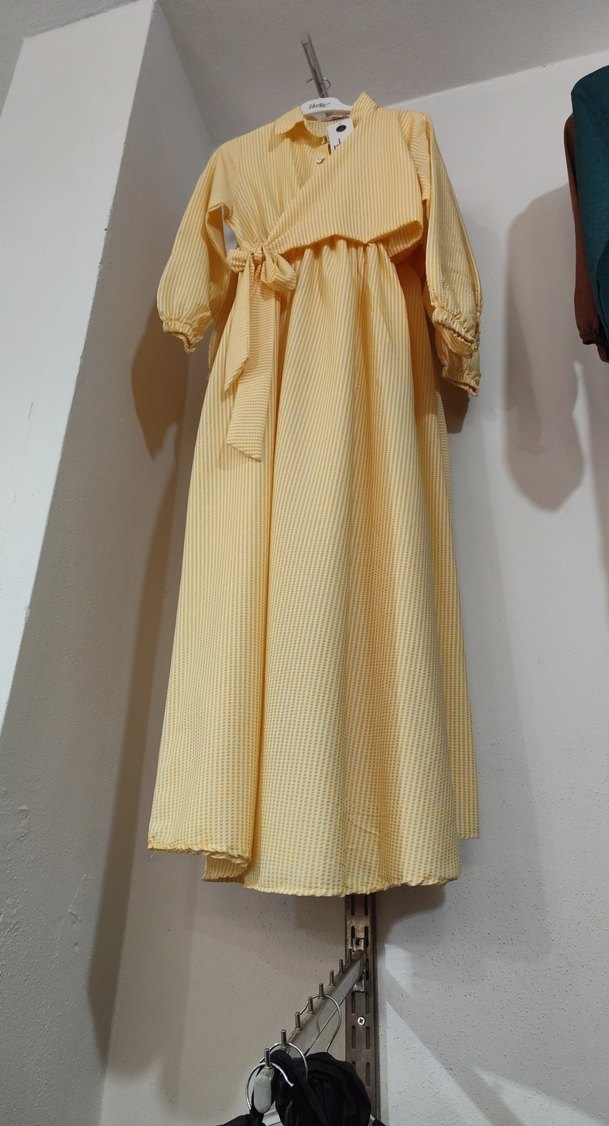 Sarı uzun keten elbise, pileli tasarımı ve bol kesimiyle dikkat çeker. Tekne yaka ve askılı kolları, günlük kullanıma uygun vintage stil sunar.