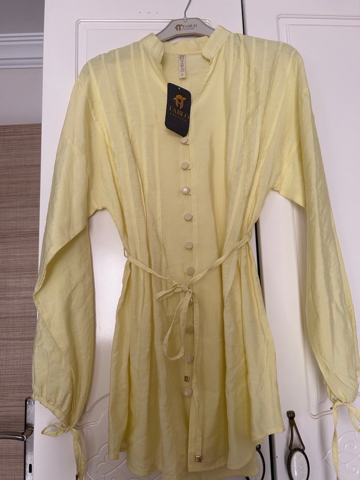 Açık sarı keten kumaştan, uzun kollu, V yakalı, düğmeli ve belden bağlamalı