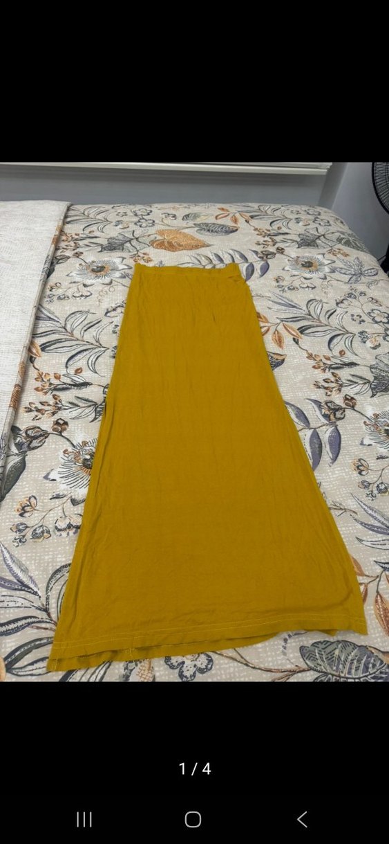 Sarı uzun keten etek, salaş kesim ve drapeli tasarıma sahiptir. Bohem tarzıyla günlük kullanıma uygundur.