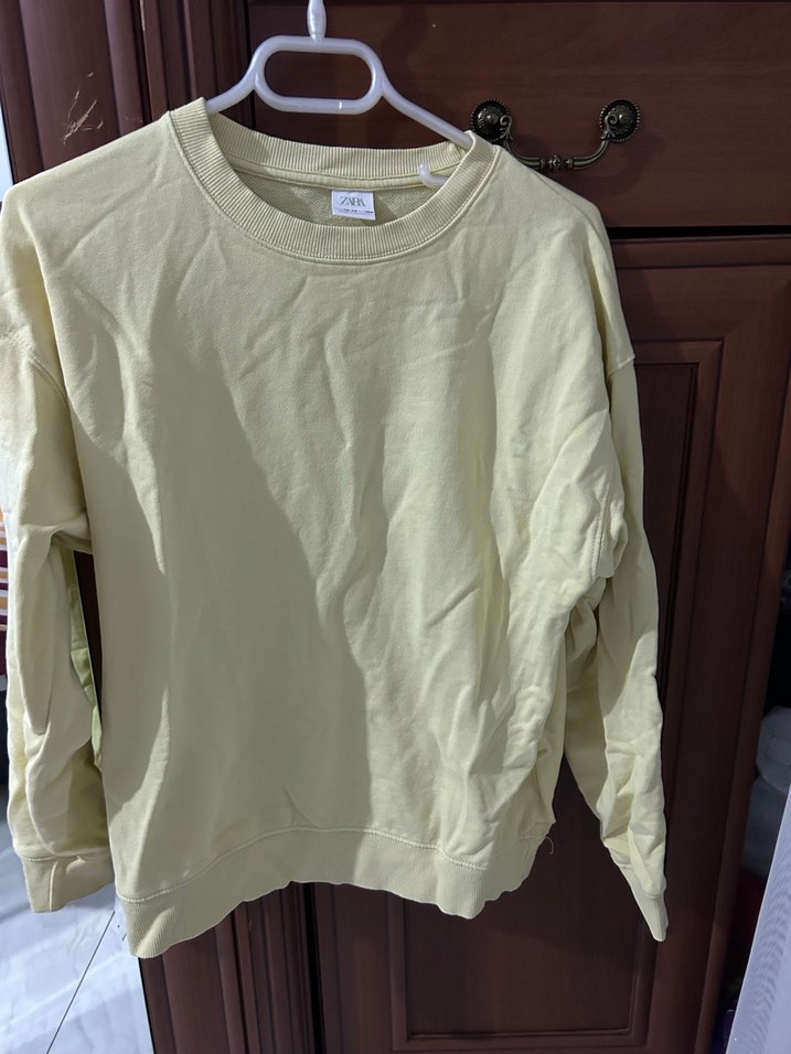 Sarı renkli, uzun kollu, yuvarlak yaka ve bol kesim kadın sweatshirtü. Yumuşak keten kumaştan, desen içermeyen, günlük sokak stili için uygun minimal tasarım.