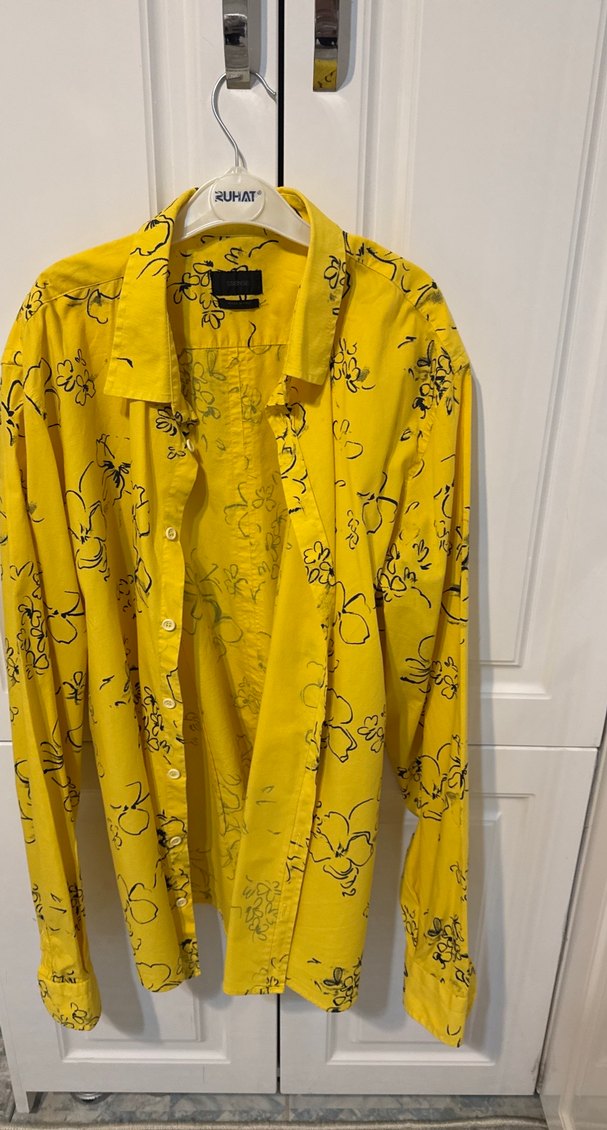 Sarı, baskılı desenli, uzun kollu erkek gömlek. Geniş kesim ve düğmeli ön kısmı ile günlük kullanıma uygun. ✨