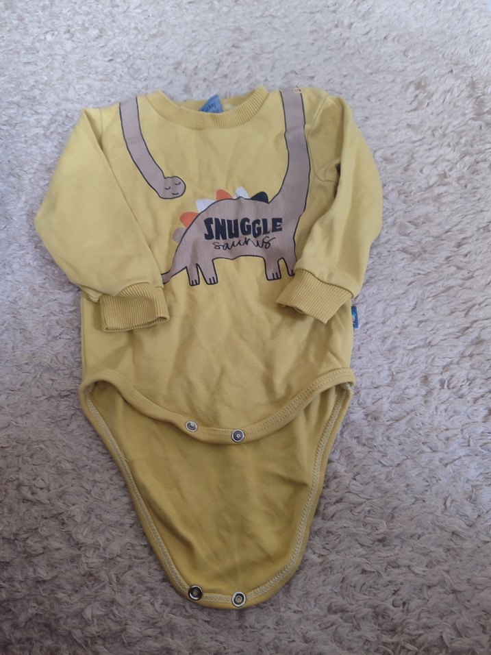 Pastel sarı renkte uzun kollu, yuvarlak yakalı bebek body. Yumuşak ve sıcak kumaştan, altı çıtçıtlı, dinozor ve "SNUGGLE" baskılı.