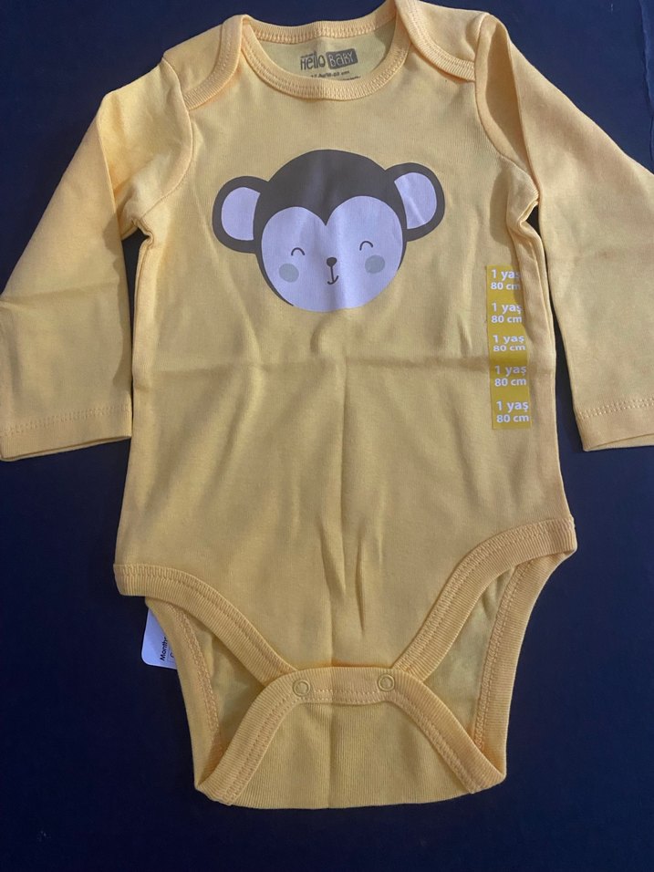 Sarı uzun kollu, yuvarlak yaka bebek body. Yumuşak ve sıcak kumaştan, düğmeli, maymun baskılı.