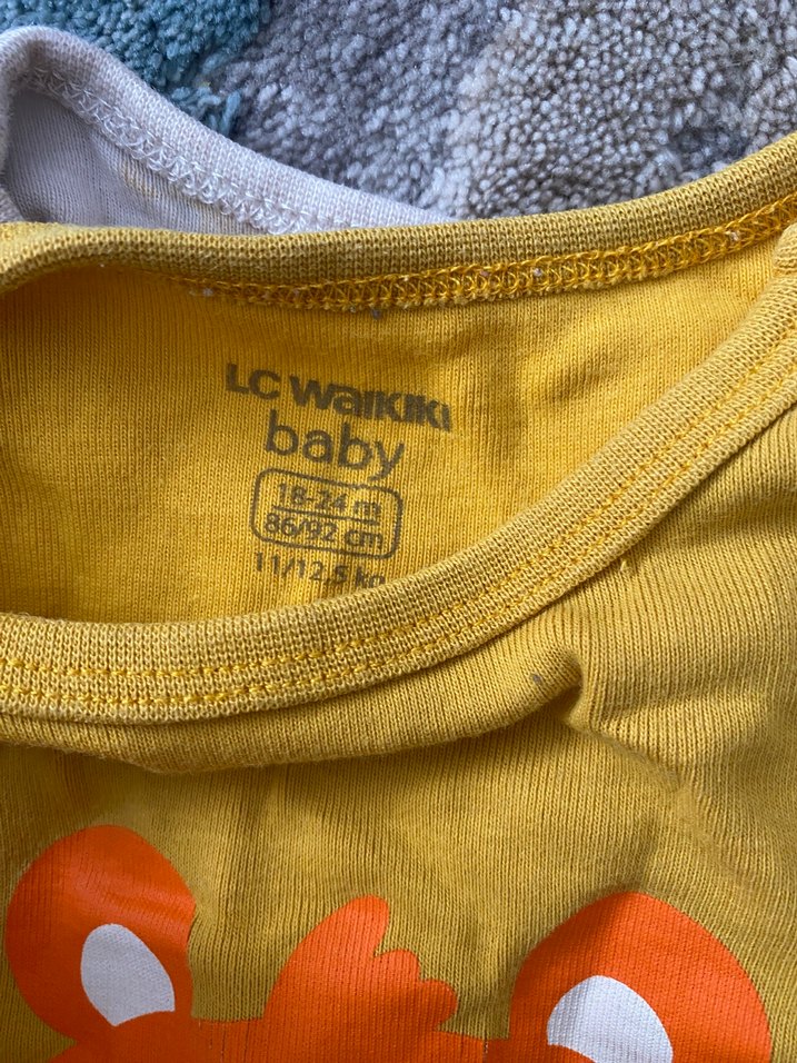 2adet yeni ayarında kısa kol zıbın Sarı renk, uzun kollu, düğmeli ve baskılı yumuşak yün kumaştan yapılmış bebek body. 18-24 ay (86/92 cm) bedenlere uygundur.