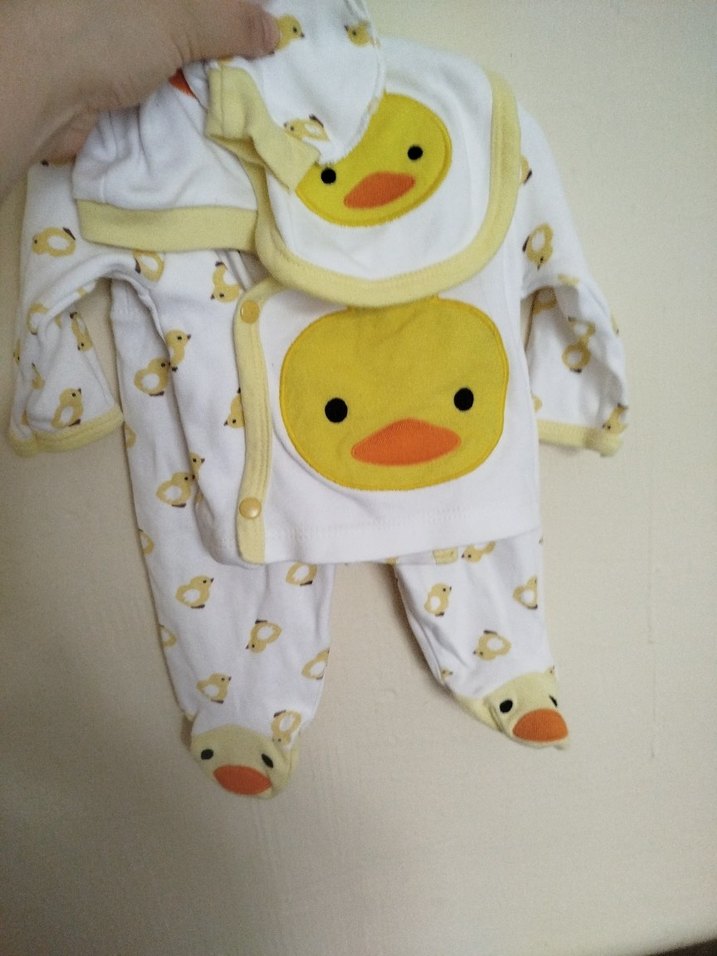 Sarı uzun kollu ve düğmeli, rengarenk ördek desenli bebek hastane çıkışseti. Önlük ve ayaklı pantolon içerir. 5 parça içerir. 0_3 aylık