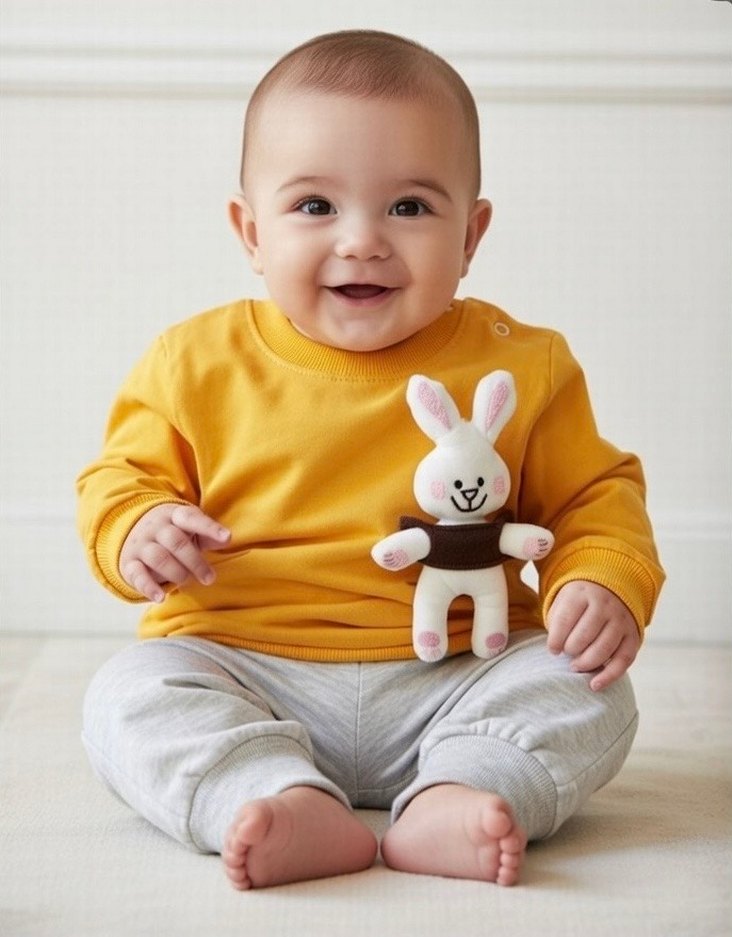 Renkli, sarı uzun kollu üst ve yumuşak gri pantolonlu, örgü tavşan detaylı bebek takımı. Baskılı, sokak tarzı görünüm sunar.