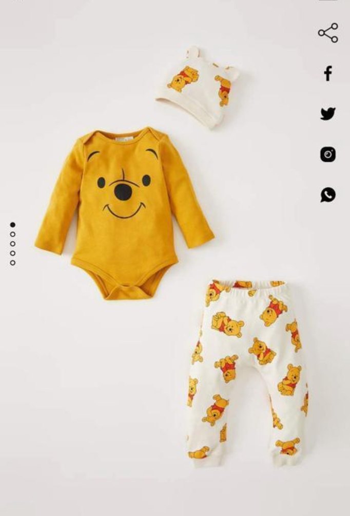 Sarı uzun kollu baskılı body, renkli desenli beyaz pantolon ve örgü şapka içeren bebek takımı. Yuvarlak yaka ve yumuşak kumaşlıdır.