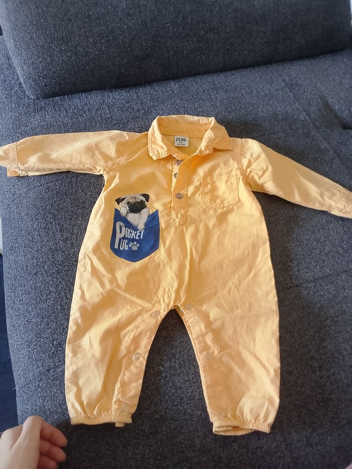Sarı renkli, uzun kollu, yakalı ve düğmeli bebek tulumu. Yumuşak ve sıcak kumaştan, ceplerde köpek baskılı deseni bulunur. Yıkadım ama hiç giydirmedim kısa olduğu için.