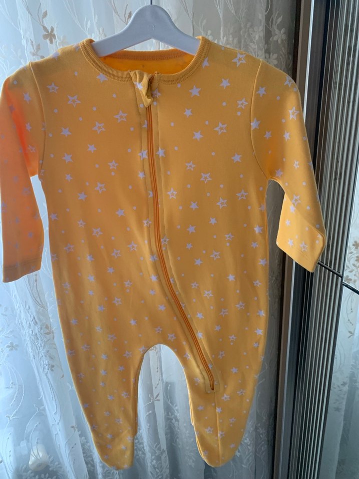 Sarı renkli, uzun kollu bebek tulumu, yumuşak ve sıcak kumaştan üretilmiştir. Renkli yıldız desenli ve kolay giydirme için fermuarlı tasarıma sahiptir.