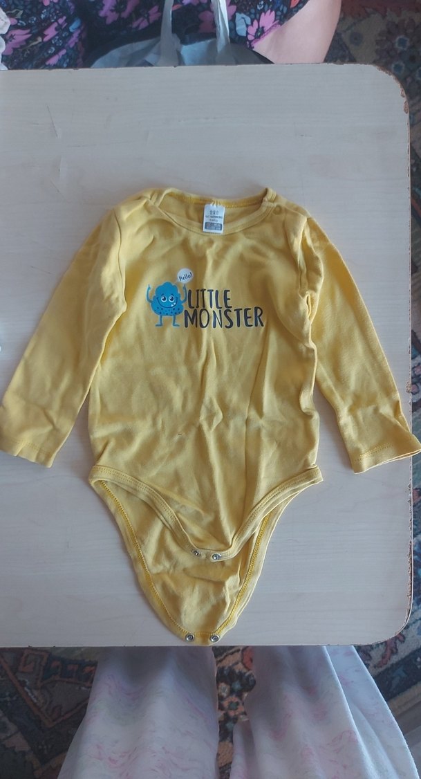 Pastel sarı renkte, uzun kollu ve düğmeli bebek body. Önünde 'Little Monster' baskısı bulunur.