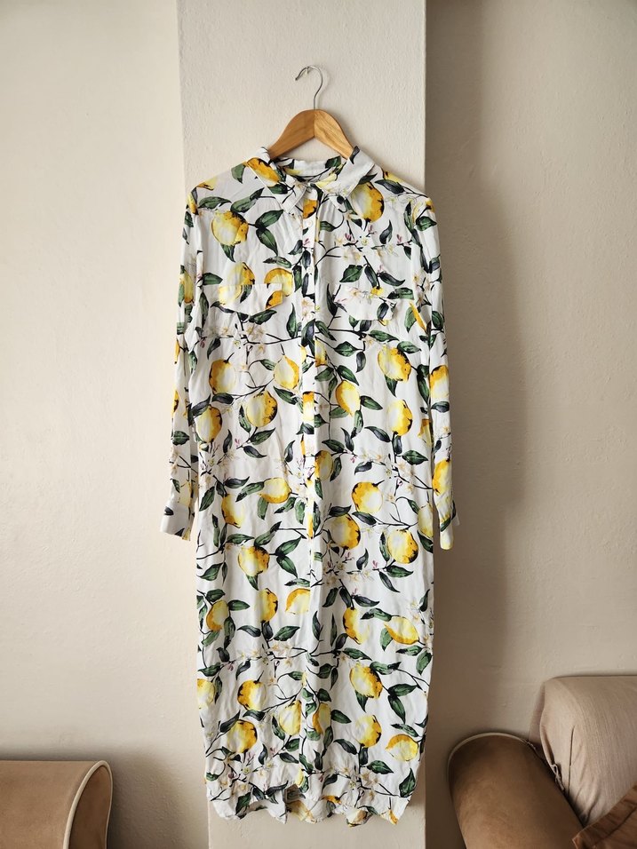 Sarı Limon detaylı beyaz renkli, düğmeli, yakalı, uzun kollu, salaş kesim tunik/elbise. Yumuşak kumaştan, düğmeleri dikişli açılmaz, kemer yeri olan, rahat ve günlük kullanıma uygun.