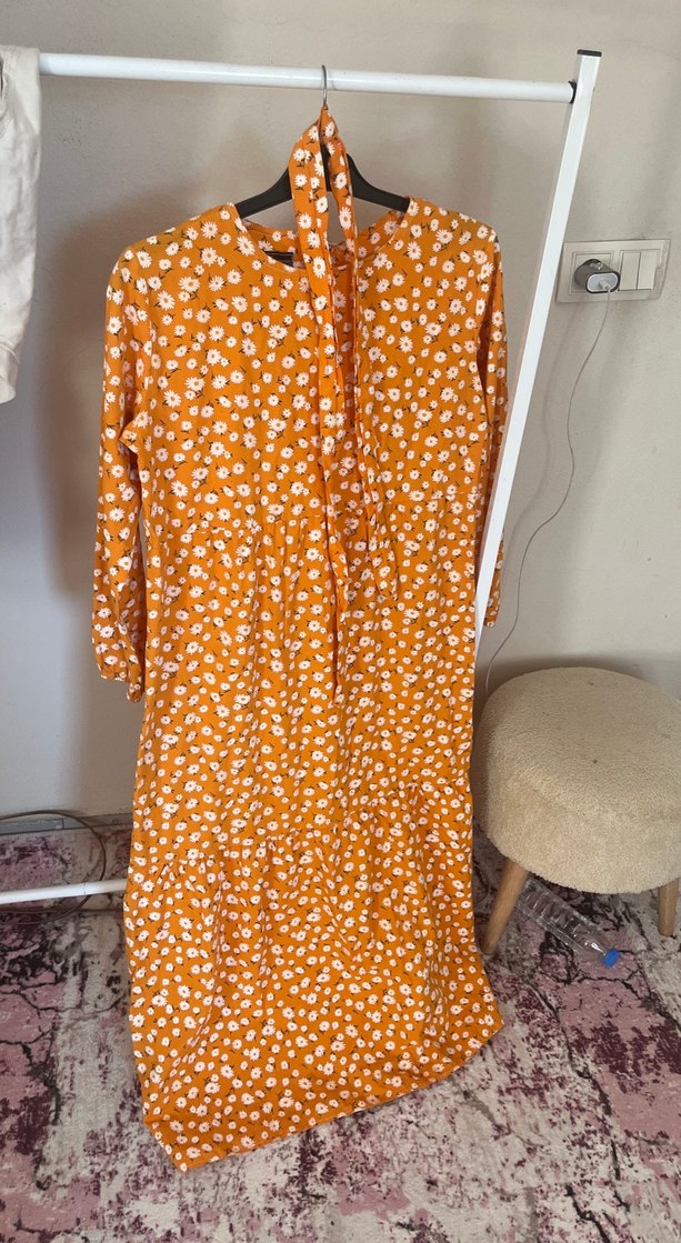 Sarı renkli, uzun kollu, bol kesim, çiçek desenli uzun elbise. V yaka ve dökümlü tasarıma sahip, sentetik kumaştan üretilmiştir.