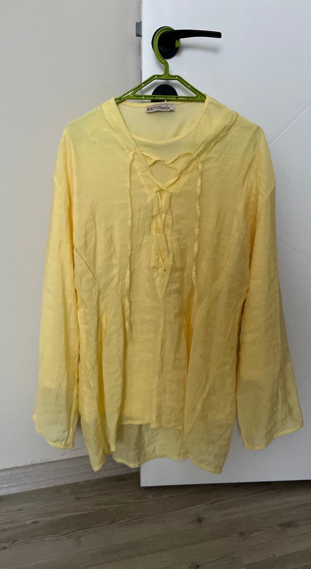 Sarı keten kumaştan, uzun kollu iç astarlı ve V yakalı, ipli, bohem tarzda günlük kullanıma uygun salaş gömlek etek takım