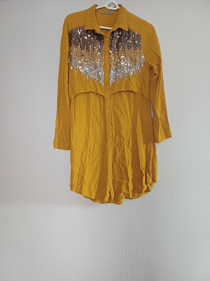 Parlak sarı renkte, uzun kollu, düğmeli, bol kesim kadın gömleği. Nakış detayları ve askısız yaka ile bohem tarzını yansıtır. ✨