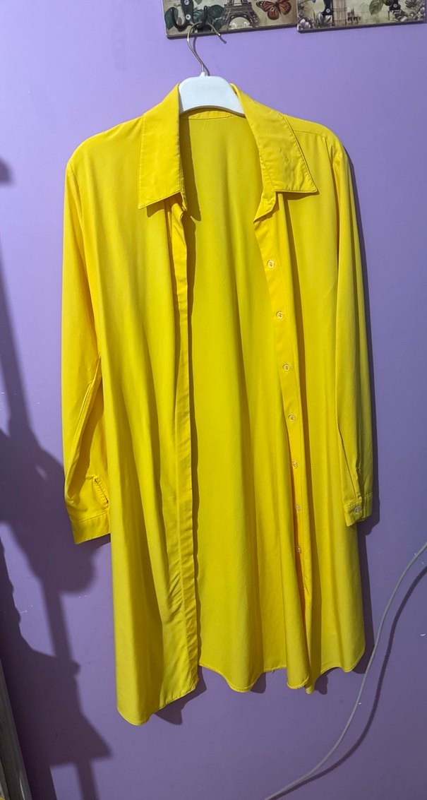 Sarı uzun kollu kadın gömlek, düğmeli ve yakalıdır. İpeksi kumaştan yapılmış, parlak ve salaş kesimdir, minimalist sokak tarzına uygundur.