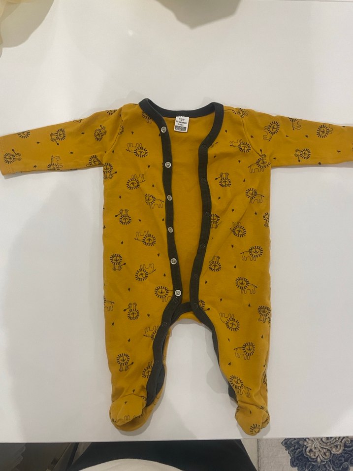 Uzun kollu, düğmeli, sarı renkli, yumuşak kumaştan yapılmış baskılı erkek bebek tulumu 0-3 aylık 1-2 kere anda giyildi temiz kullanıldı lc Waikiki