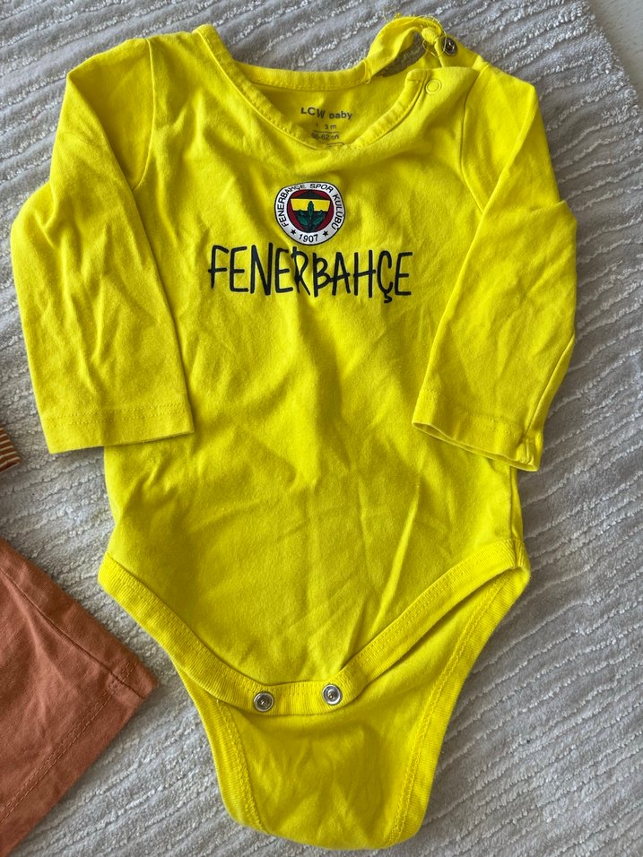 Yumuşak ve sıcak kumaştan yapılmış, sarı uzun kollu bebek body. Yuvarlak yaka ve çıtçıtlı kapama ile Fenerbahçe baskısı bulunur.