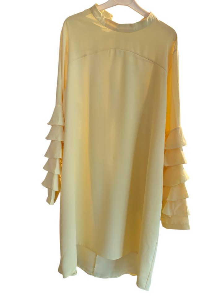 Limon Sarı renkte, uzun kollu ve yüksek yakalı, bol kesim kadın tunik. Kollarda kat kat fırfır detayları vardır.Defosuzdur