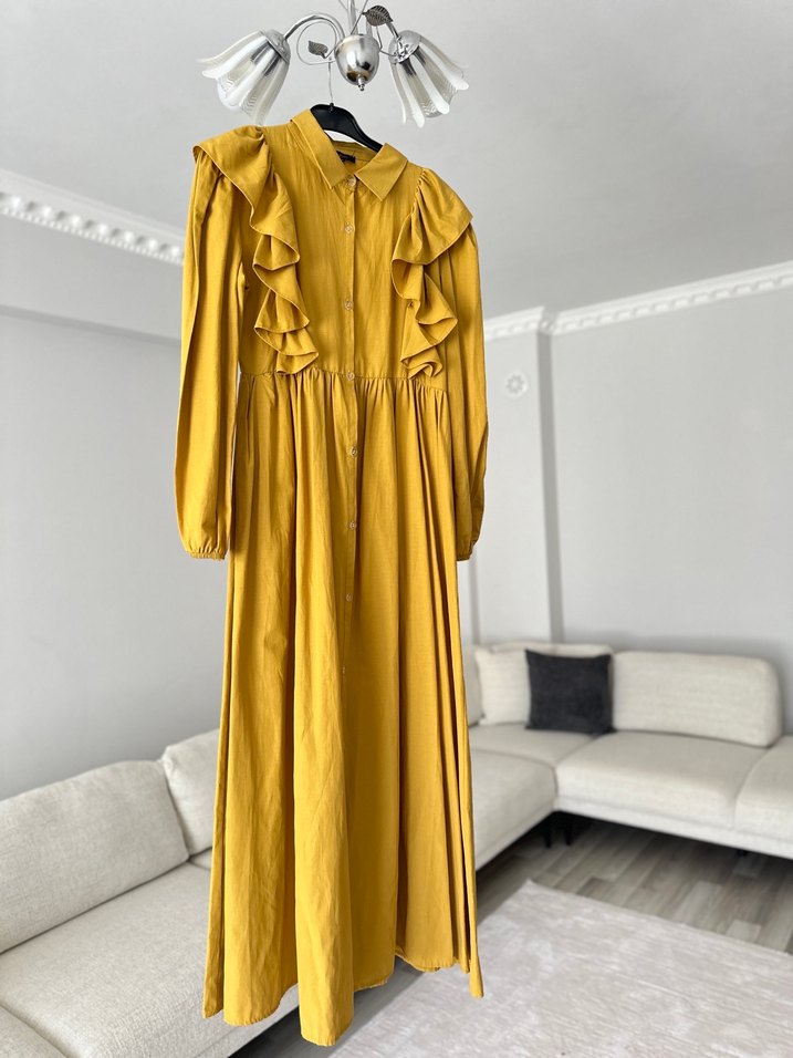 Sarı keten kumaştan yapılmış, uzun kollu, yakalı ve fırfır detaylı uzun elbise. Gevşek kesimi ve parlak dokusuyla modern klasik Paris tarzını yansıtır.