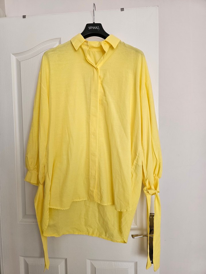 Sarı uzun kollu, düğmeli ve yakalı midi uzunluğunda bol kesim gömlek. Pastel tonlarıyla günlük sokak stiline uygun. Yeni hiç kullanılmadı