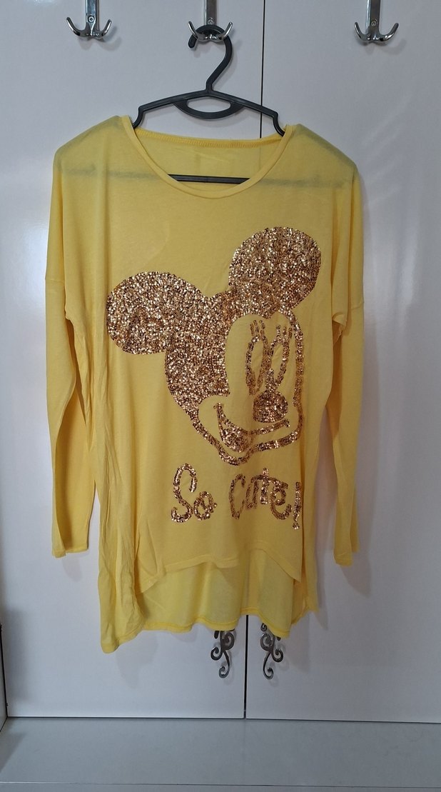 Sarı, uzun kollu hamile tişörtü, bol kesim ve bisiklet yaka ile rahatlık sağlar. Parlak baskılı ve örme pamuk kumaştan üretilmiştir. Günlük kullanım için uygundur.