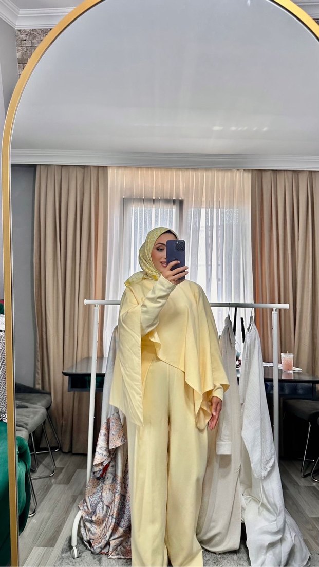 Sarı renkte, uzun kollu, salaş kesim ve desensiz minimalist kadın tulumudur .