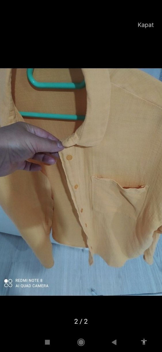 Sarı, uzun kollu keten gömlek, düğmeli ve yakalıdır. Rahat kesimi ve midi boyu ile günlük sokak stiline uygundur.