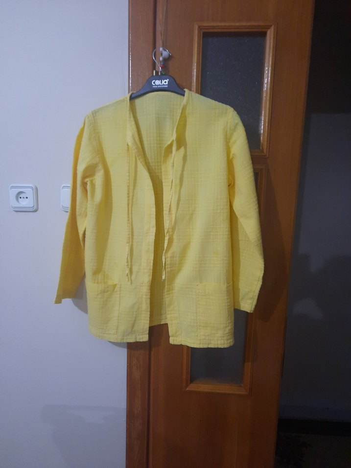 Sarı renkli, keten kumaştan üretilmiş, düğmeli ve uzun kollu kadın ceket Salaş kesimi ve yakası notched lapel stilde, midi boyda rahat bir tasarım. kolunun arka kısmında Hafif küçük lekeli ama kolu kıvırınca görünmüyor çok belli değil