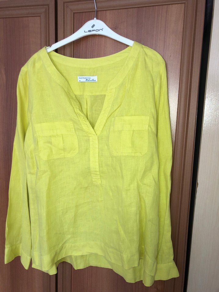 Uzun kollu, keten kumaştan, sarı renkli, V yakalı, düğmeli ve bol kesim kadın gömleği. Normal midi boyunda, günlük kullanıma uygun.