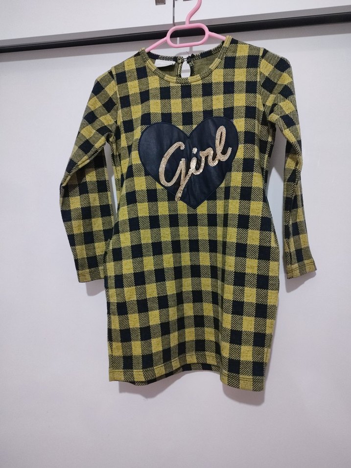 Sarı renkli, örgü kumaştan uzun kollu, düz yakalı, bol kesim elbise. Üzerinde karışık desen ve 'Girl' yazısı bulunur.