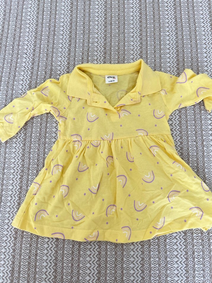 Pastel sarı renkte, uzun kollu, yakalı ve salaş kesim kız çocuk elbisesi. Sentetik yumuşak kumaştan, fırfır detaylı ve batik desenlidir.