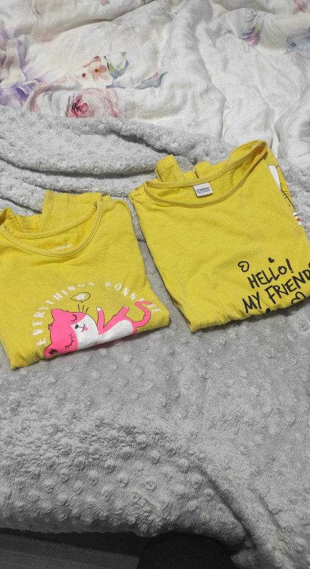 Yumuşak kumaştan yapılmış, uzun kollu sarı kız çocuk tişörtü, renkli baskılar ve bisiklet yaka ile rahat ve şık bir görünüm sunar. ✨ikili uzun kollu biri 8-9 yaş diğeri 9-10 yaş