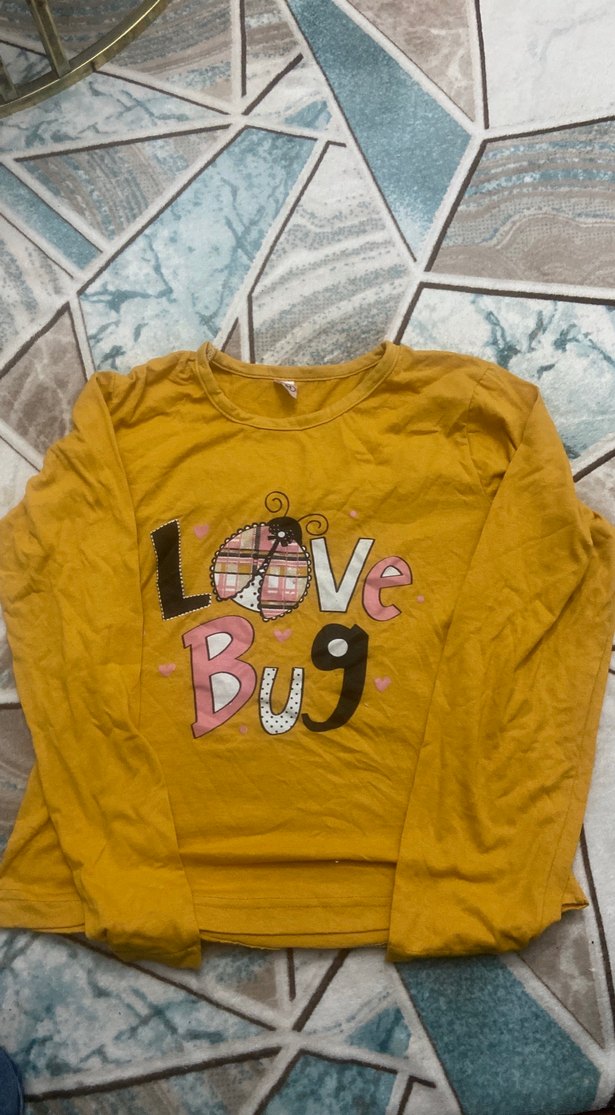 Sarı, pamuklu, uzun kollu, bol kesim kız tişörtü. Renkli "Love Bug" baskılı, düğmeli detaylı, yuvarlak yakalı.