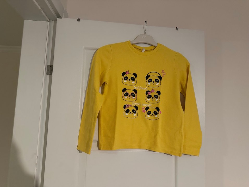 Sarı uzun kollu kız tişörtü, yuvarlak yaka ve bol kesimlidir. Yumuşak örme kumaştan yapılmış ve renkli panda baskılarıyla süslenmiştir.