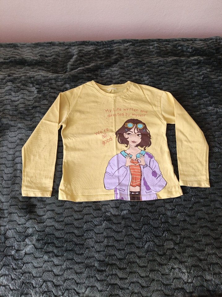 Sarı, uzun kollu kız tişörtü, yuvarlak yaka ve baskılı desenle. Yumuşak sentetik kumaştan, düğme detaylı, rahat kesim. Trendy günlük stil için uygun.