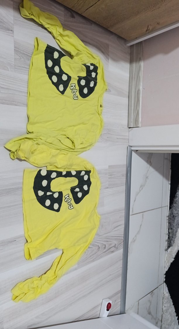 Sarı, uzun kollu kız tişörtü, renkli baskılı ve düğme detaylıdır. Yumuşak, sıcak kumaştan, yuvarlak yakalı ve bol kesimdir.