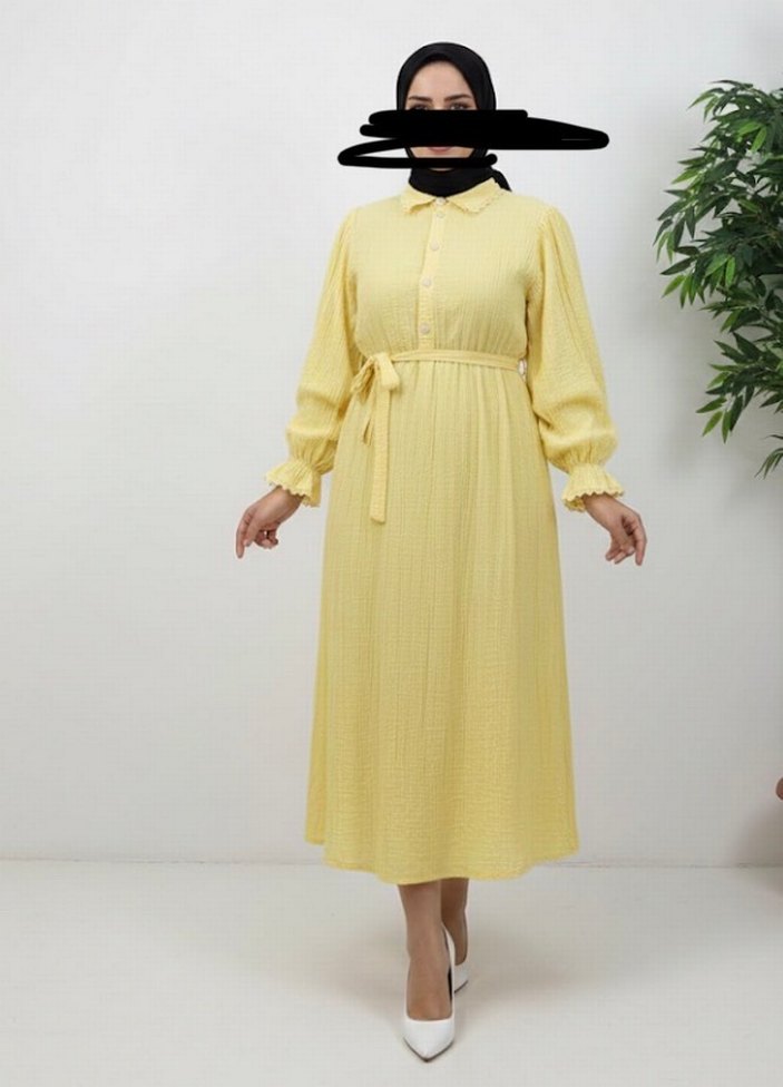 Sarı uzun kollu elbise, yakalı ve pileli detaylara sahip. Rahat kesimli ve yumuşak keten kumaştan, günlük sade sokak tarzı için uygundur.