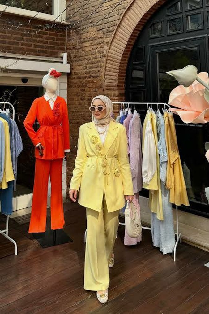 Sarı uzun kollu, notlu yakalı ve batik desenli kadın takımı. Sentetik kumaştan, regular fit ve uzun boy, zahmetsiz şıklık için ideal.