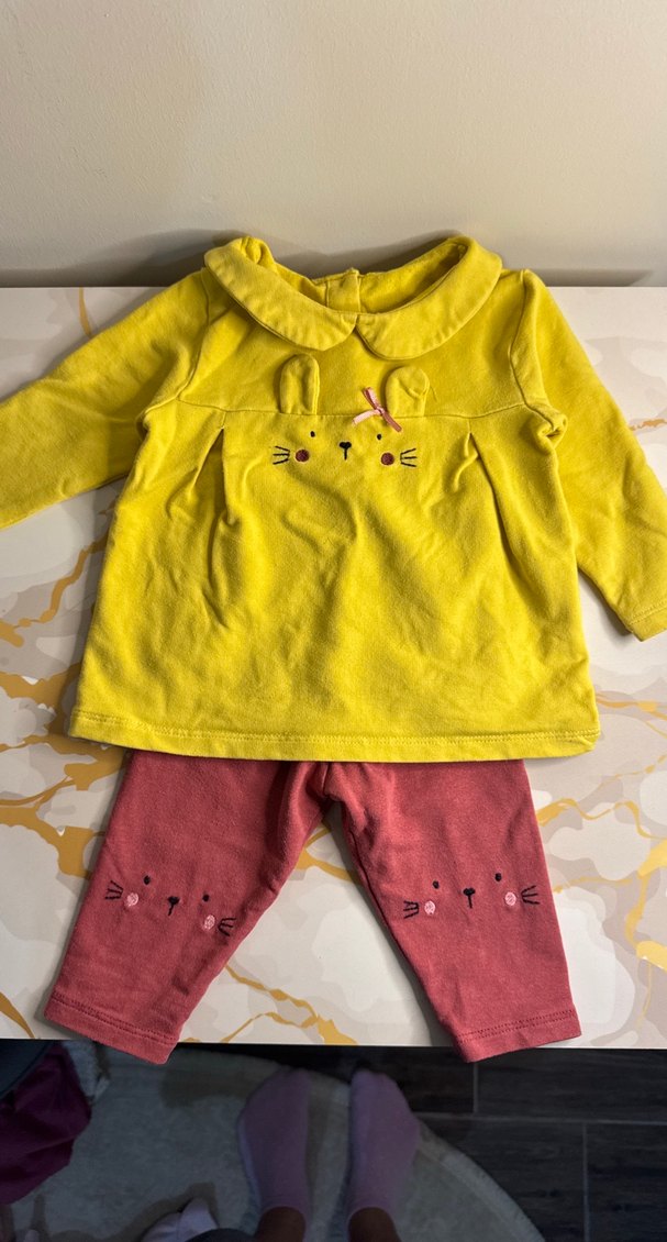 Renkli, örgü sarı uzun kollu üst ve pembe detaylı pantolon içeren bebek kız takımı.