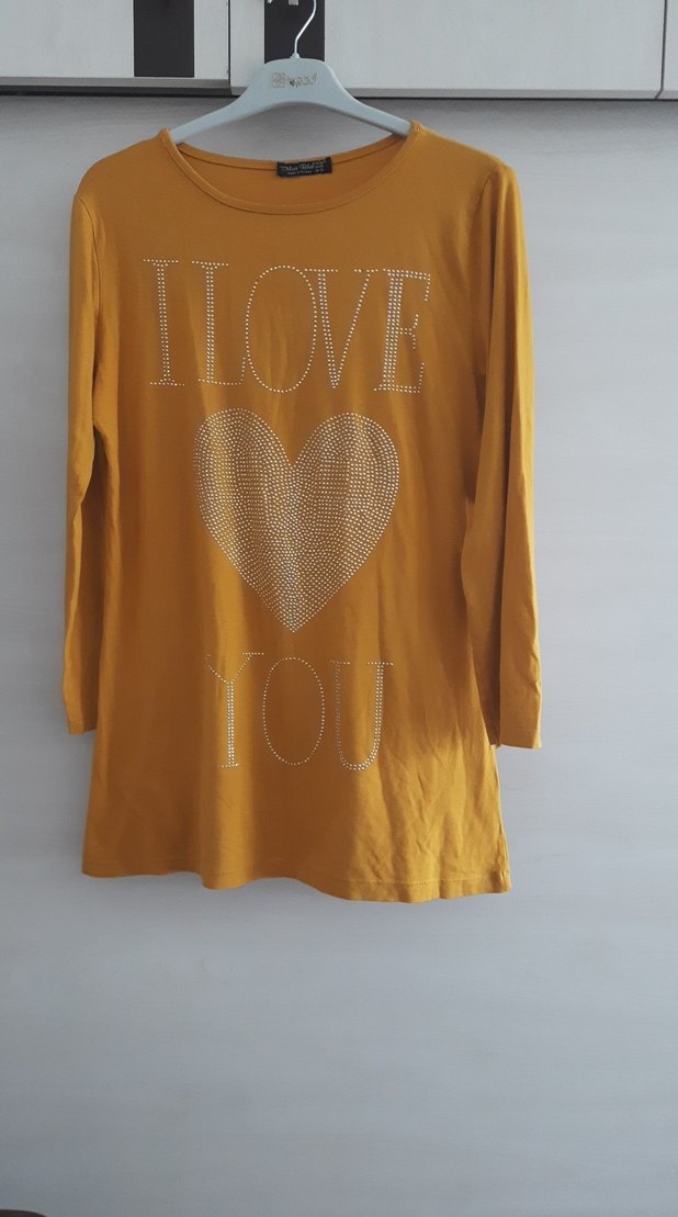 Sarı, uzun kollu, yuvarlak yaka, payetli "LOVE" baskılı ve kalp desenli, rahat kesim tunik iki koltuk arası 55cm boyu 80cm dir✨
