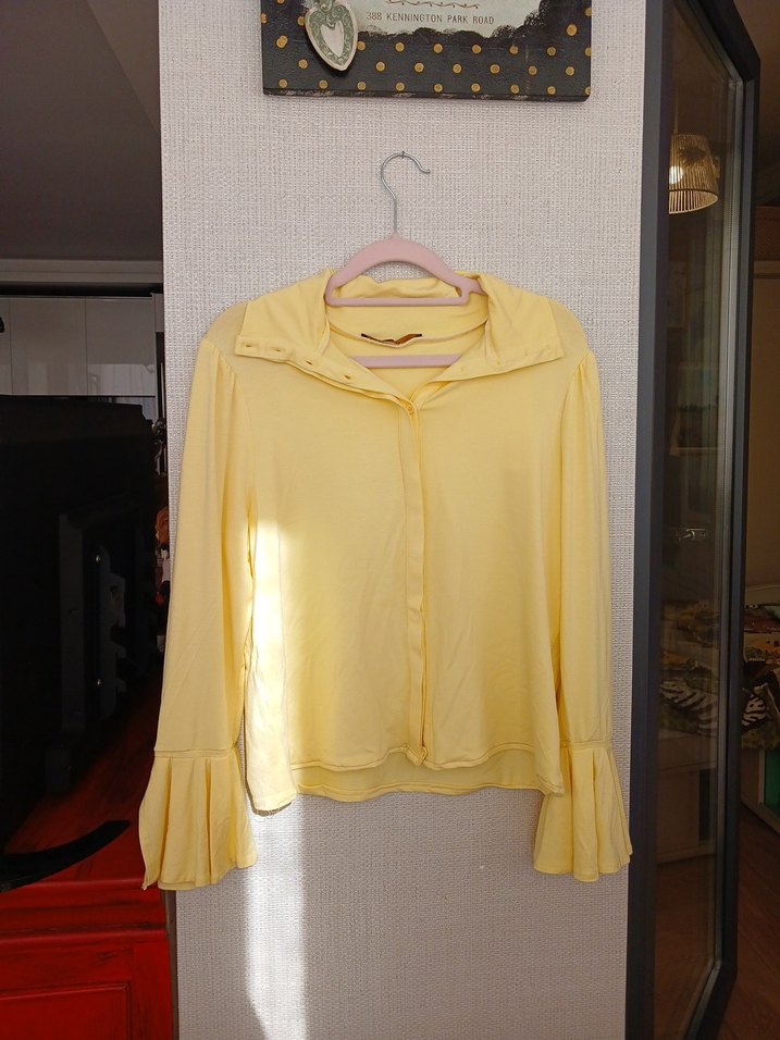 Sarı keten kumaştan, uzun kollu, yüksek yakalı, düğmeli ve bol kesim gömlek. Günlük kullanıma uygun bohem tarzda. Koltukaltından fırfırın bitimine kadar 41 cm'dir.