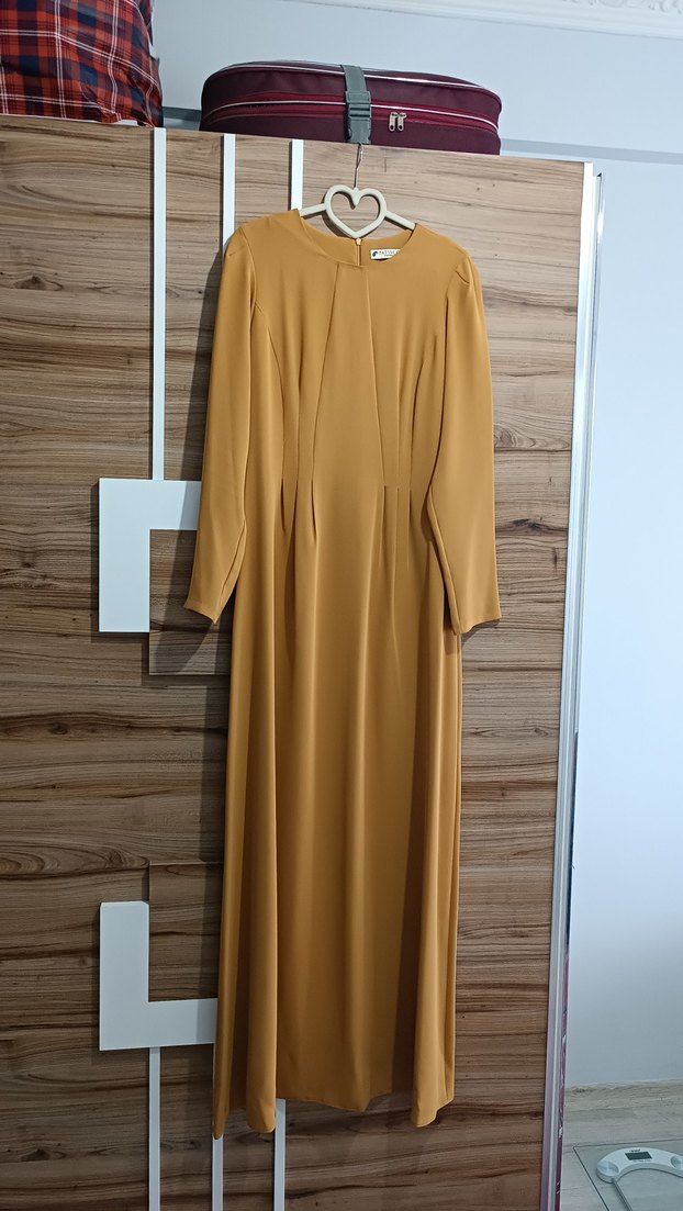 Sarı renginde, uzun kollu ve yuvarlak yakalı piliseli uzun kadın elbisesi. Sentetik kumaştan, modern klasik ve minimal tarzda, ofis için uygun. teklif verebilirsiniz