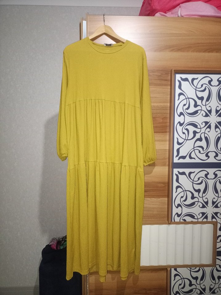 Sarı uzun kollu, yuvarlak yakalı, keten kumaştan yapılmış piliseli ve bol kesim elbise. Minimalist ve günlük kullanıma uygun.