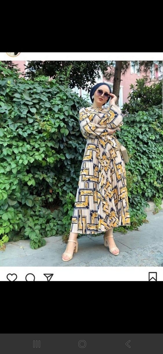 Sarı, yüksek yakalı, piliseli ve salaş kesim uzun elbise. Sentetik kumaştan üretilmiş, açık tonlu batik desenlidir. Günlük sokak stiline uygun. 2 kez giyildi