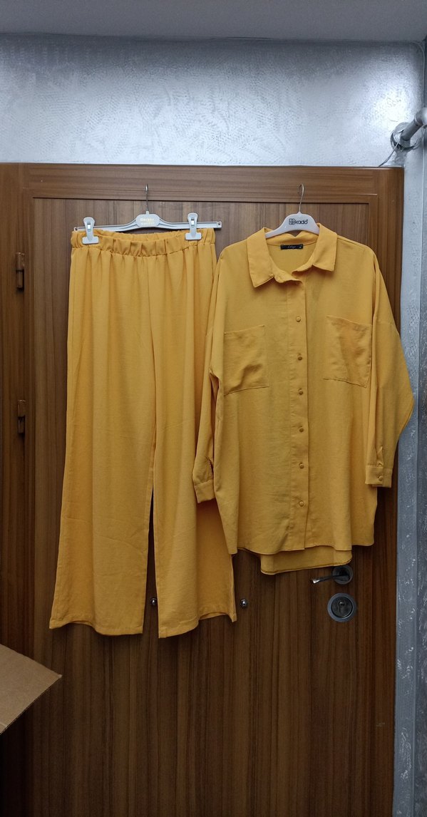 Açık sarı renkte, keten kumaştan, uzun kollu ve rahat kesim kadın takımı. Düz desensiz, yakalı ve sokak stiline uygun, zahmetsiz şıklık sunar. ✨