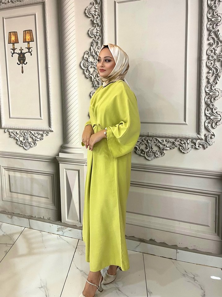Sarı renkli, uzun kollu ve yüksek yakalı bu elbise, salaş kesimi ve drapeli detaylarıyla dikkat çekiyor. İpeksi kumaştan yapılmış, hafif batik desenli, minimalist ve modern tarzda günlük kullanım için uygun.