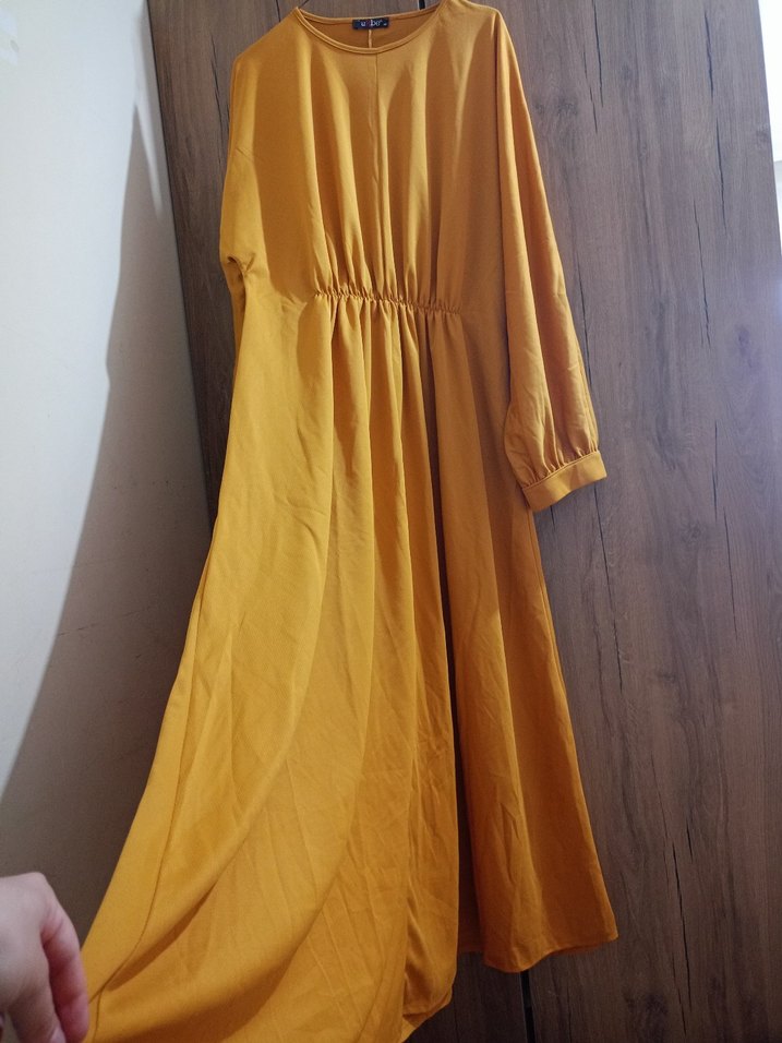 Sarı renkli, uzun kollu, yuvarlak yakalı ve salaş kesimli keten elbise. Belde drapeli detay ve parlak dokusu ile sade, gündelik kullanıma uygun.