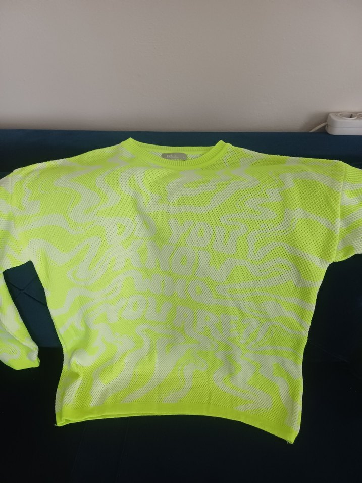 Sarı uzun kollu, gevşek kesim triko kazak. Sentetik kumaştan örülmüş, renkli baskılı desene sahip, sokak stili ve athleisure için uygun.