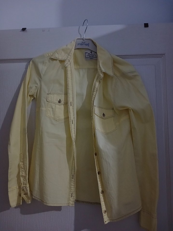 Düğmeli, uzun kollu, sarı renkli gömlek. ön cep detayları bulunur.